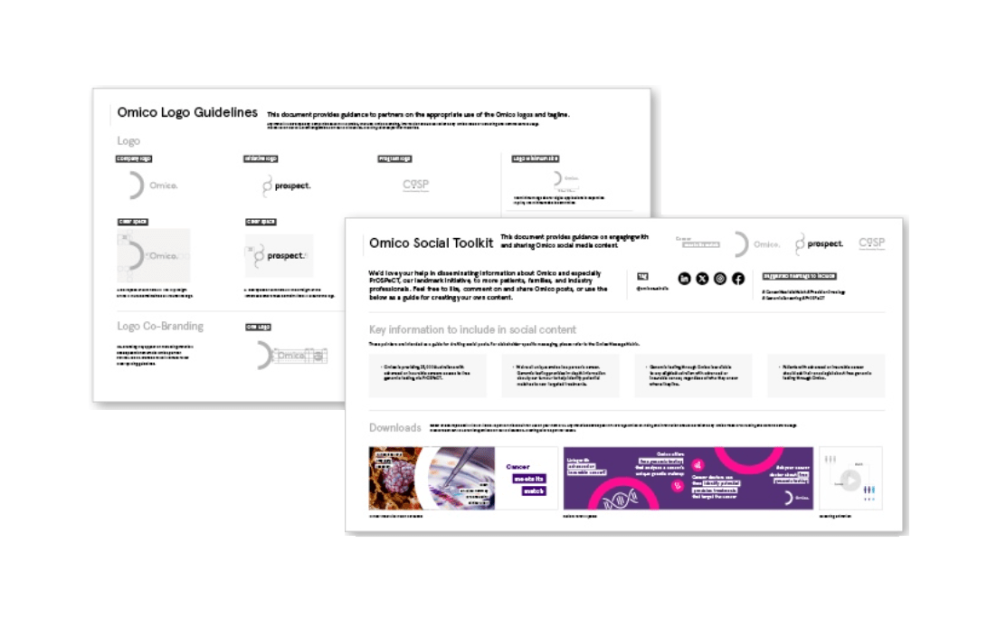 Discover our comprehensive toolkits designed to simplify sharing information about Omico and PrOSPeCT. The Partner Toolkit includes essential items like the Omico Brand Guidelines, a detailed Messaging Matrix for all audiences, and an array of packaged logos for our Cancer Screening Program (CaSP), PrOSPeCT, and Omico. Additionally, it includes brochures detailing how CaSP works, the benefits for industry participation, and the goals driving our PrOSPeCT initiative. Additionally, the Social Toolkit offers easy-to-follow social guidelines and ready-to-use social assets. Download each toolkit using the links below and join us in expanding our reach.